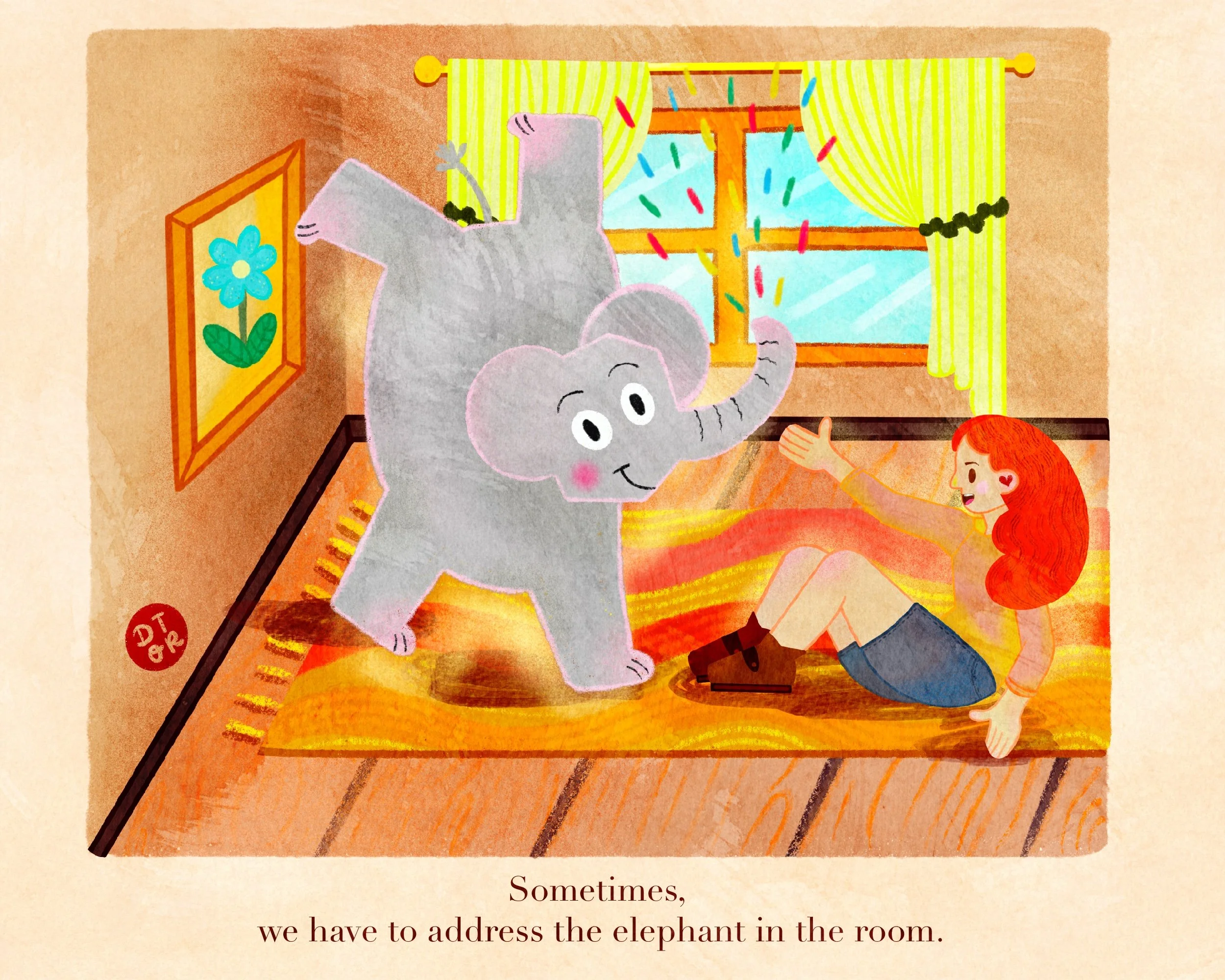 “Sometimes, we have to address the elephant in the room” made with literal intention that we need to tackle the elephant in the room—because ignoring it is just asking for a trunk-sized problem! *pun-intended hehe